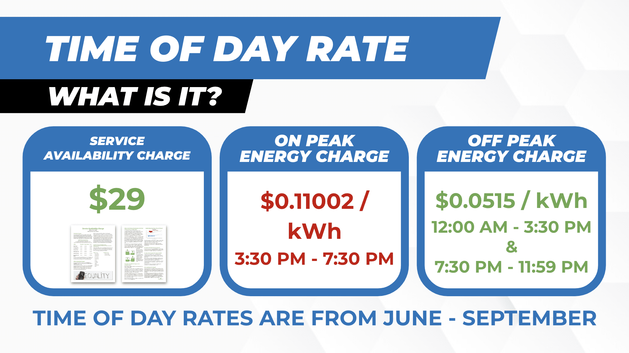Here’s how it works: Our Time-of-Day Rate program charges different rates depending on the time of day you use electricity. The Time-of-Day Rate takes effect between June and September, and the peak period is between 3:30 pm and 7:30 pm. Non-peak rates are $0.0515/kWh, and On-Peak rates are $0.11002/kWh.
